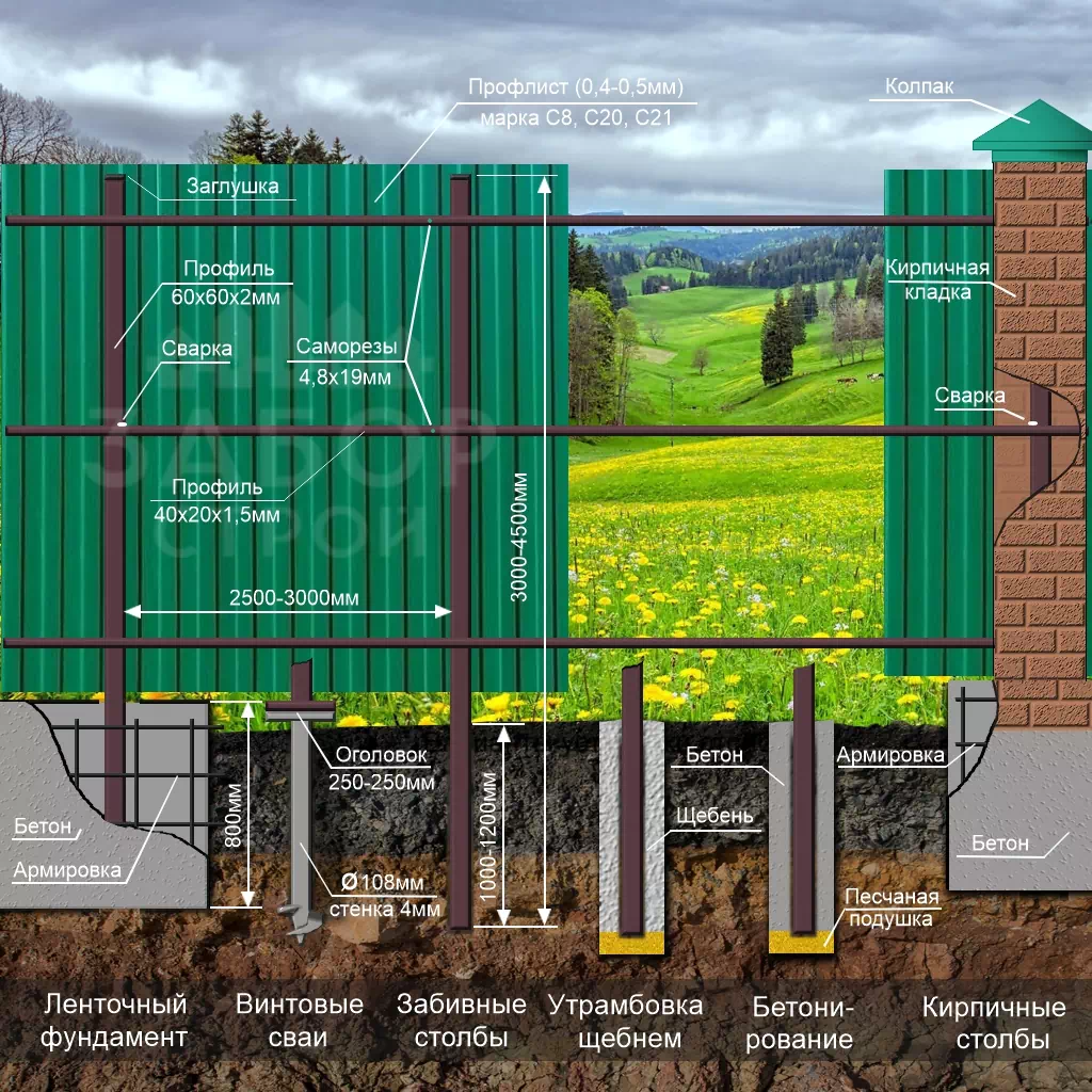 Конструкция забора из профнастила с забивными столбами